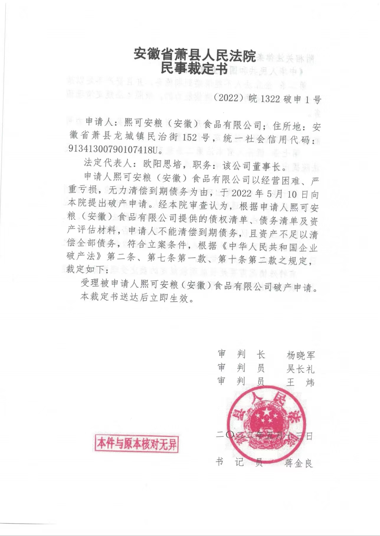 · 熙可安糧(安徽)公司依法破產(chǎn) 2022-07-06